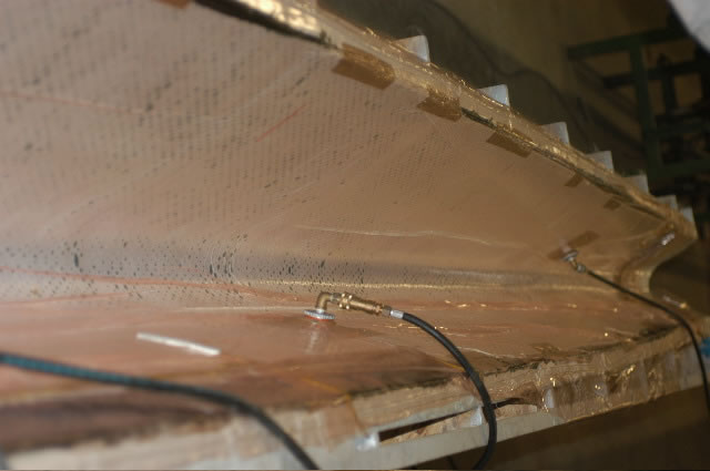 Our product is laminated on a male mould , compacted and cured in a pressure chamber at 6 bar plus the depression of the vacuum bag.